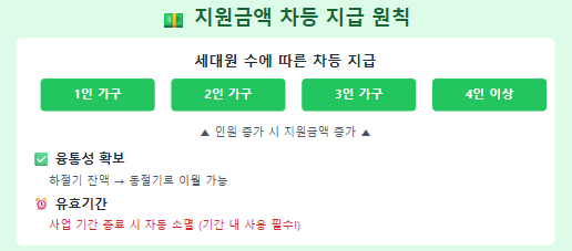 • 차등 지급 기준은 세대원 수에 따라 1인, 2인, 3인, 4인 이상 가구로 네 단계로 나뉘어 각각 지원 금액이 결정됩니다.