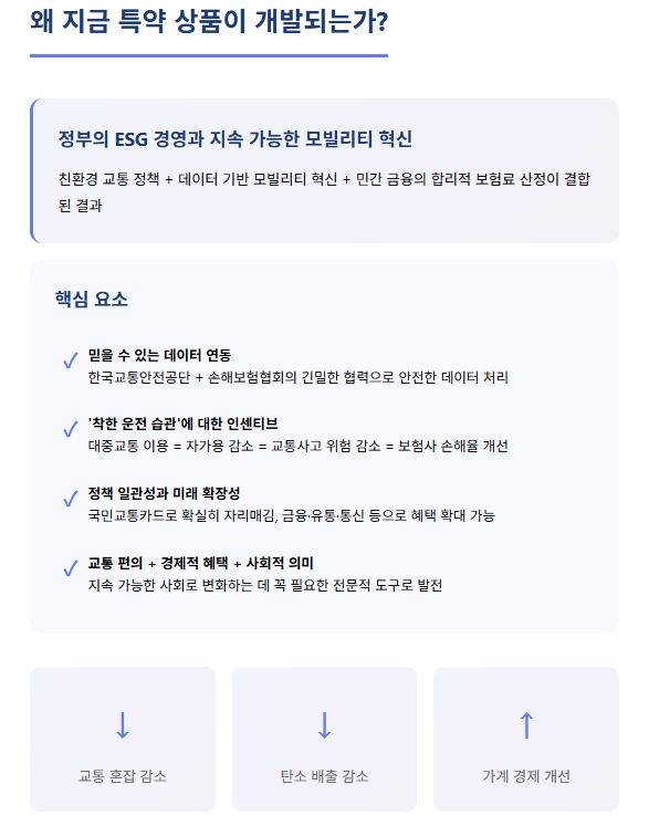 대중교통 이용을 장려해 교통 혼잡과 탄소 배출을 줄이려는 공익적 목표에, 각종 이용 데이터를 활용해 보다 합리적으로 보험료를 산정하려는 민간의 노력이 더해진 결과라고 볼 수 있습니다.