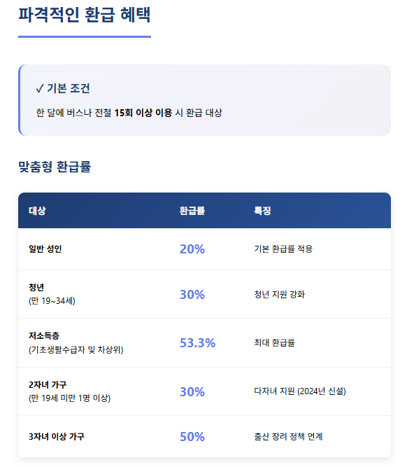 기본 환급 대상은 한 달에 버스나 전철을 15회 이상 이용할 때 해당되고, 교통비의 일부를 돌려받게 됩니다.