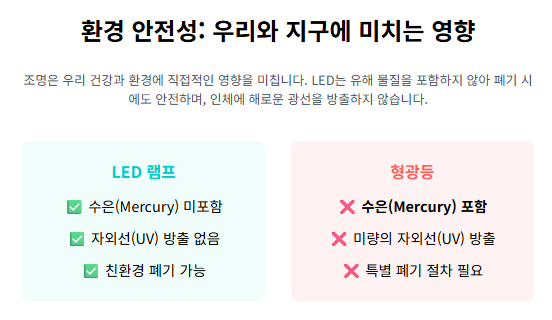 • 형광등에는 수은 가스가 들어 있어 잘못 폐기하면 환경 오염 위험이 있습니다. 또한 소량이지만 자외선도 방출합니다. 반면, LED는 수은을 전혀 사용하지 않고 자외선 방출이 거의 없어 실내 환경에서 훨씬 안전하고 친환경적입니다.